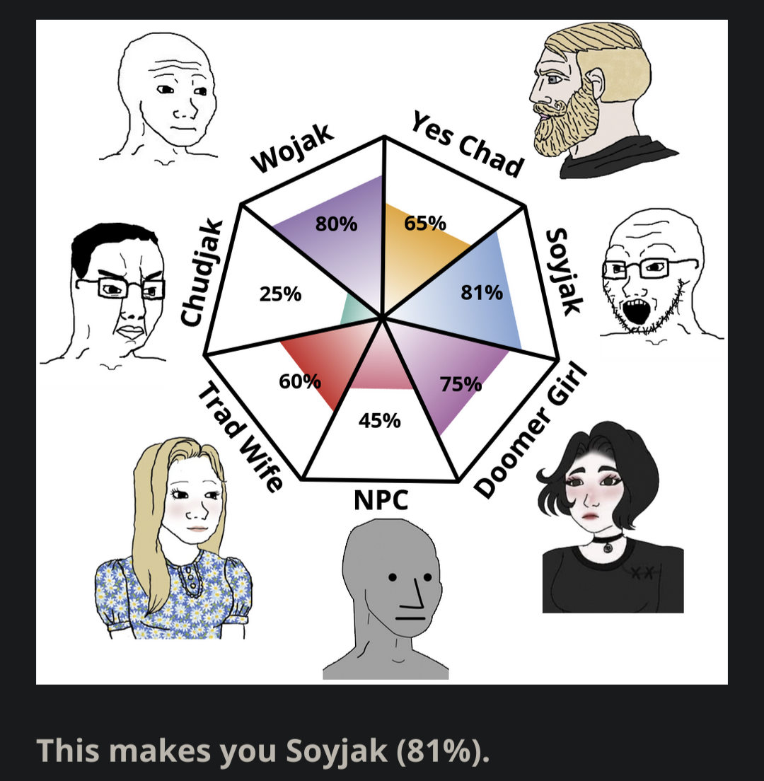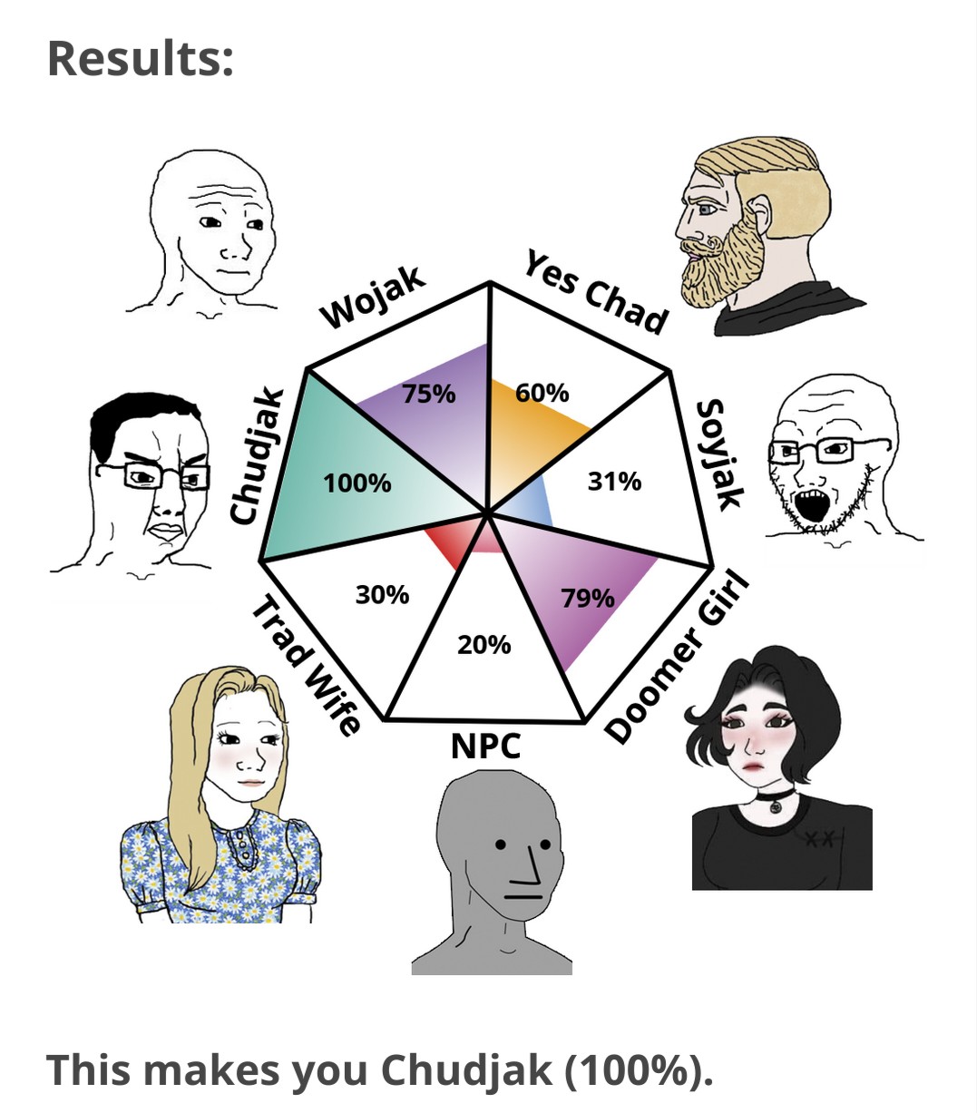 @mia I haven't used 4chan in years lol. it thinks I'm a chud because I answered strong yes for being a conspiracy theorist with weird outrageous opinions, but that's because I'm on the other end of being a political extremist