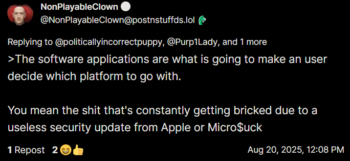 @Sui @Purp1Lady That's nice. I'm not a fairy gay faggot and I don't drink Charbucks. I don't pretend Apple is not more expensive, because I just felt it in my pocketbook getting my new MacBook Air out of necessity for my photography. Especially when I'm going through and processing over 7000+ photos like I did last year with Balloon Fiesta 2024. Not going through that shit again.