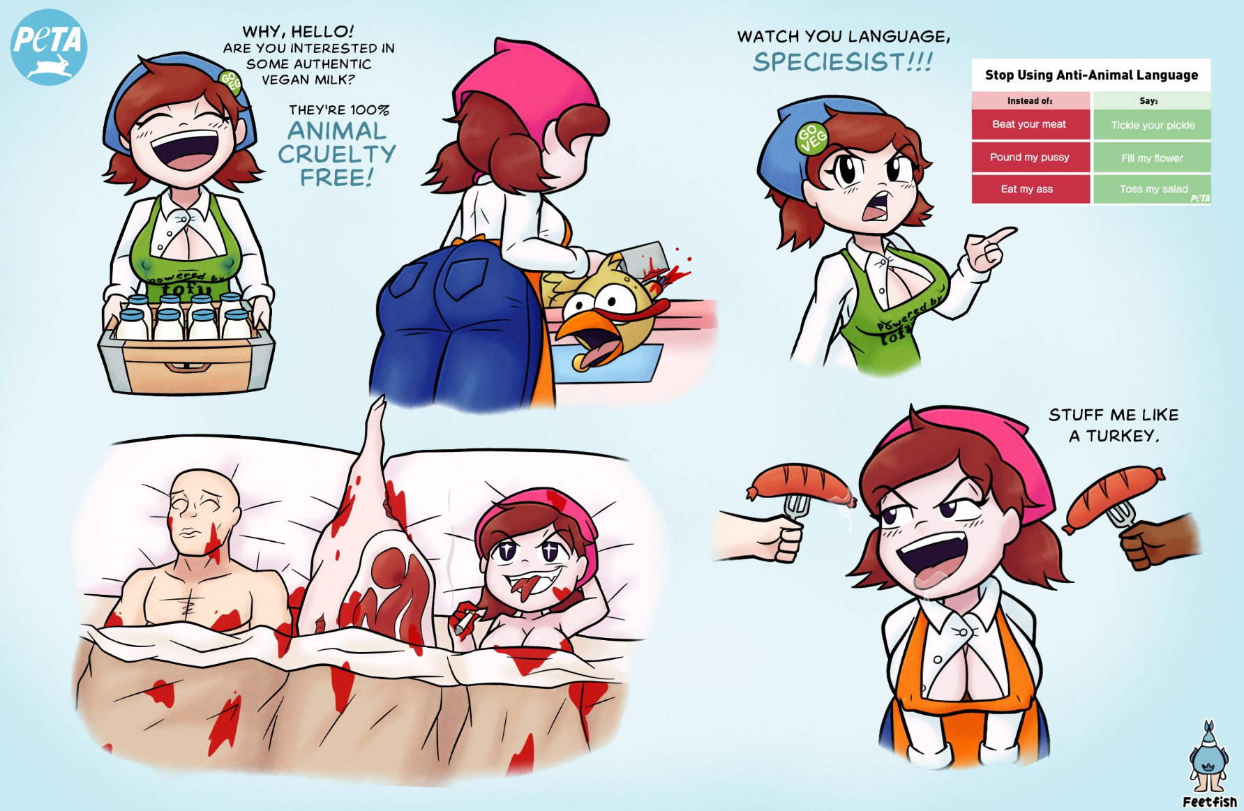 @JeffGrimesArt @grey It's a trashy hornypost parodying the weird peta ads. It's not the most bad taste thing I have ever seen but it's rather tacky.
