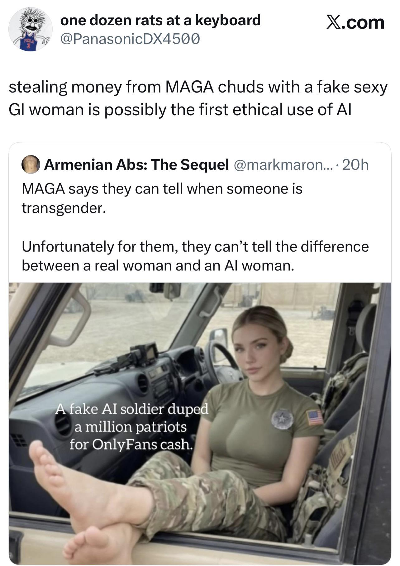 The story of Jessica Foster, the AI army influencer, is real though. It’s like a crazy enough story already, you don’t need to make up additional to be able make fun of them for this.