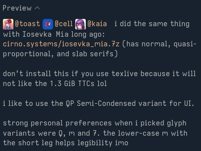 @toast @cell @kaia i did the same thing with Iosevka Mia long ago: https://cirno.systems/iosevka_mia.7z (has normal, quasi-proportional, and slab serifs)