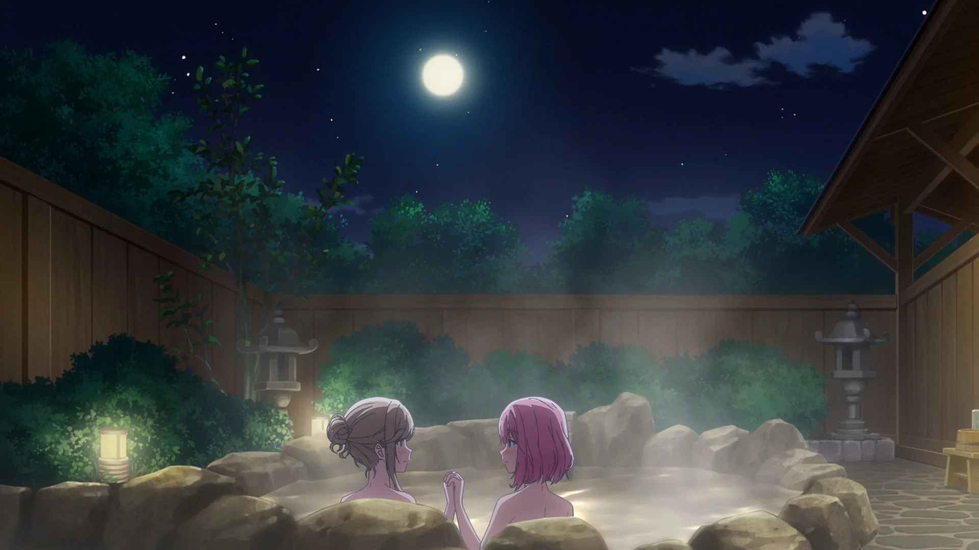 just friends being good friends, after a friendly boob-touching now sitting in hot spring holding hands (friendly)