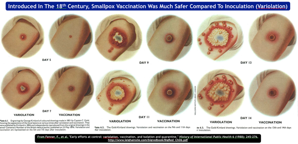 indians were the first to inoculate for smallpox, it was called variolation. you would inhale crushed pock scab material and get a mild form of smallpox. it's much safer than actual smallpox though much less safe than vaccination, it had a 1-2 percent mortality. some upper class euros had it done to them but they modified it and used a needle. you get a lot of pocks with variolation but they're concentrated around the injection site. second picture is vaccination vs variolation lesions. you can see why variolation wasn't as widely adopted as vaccination lol