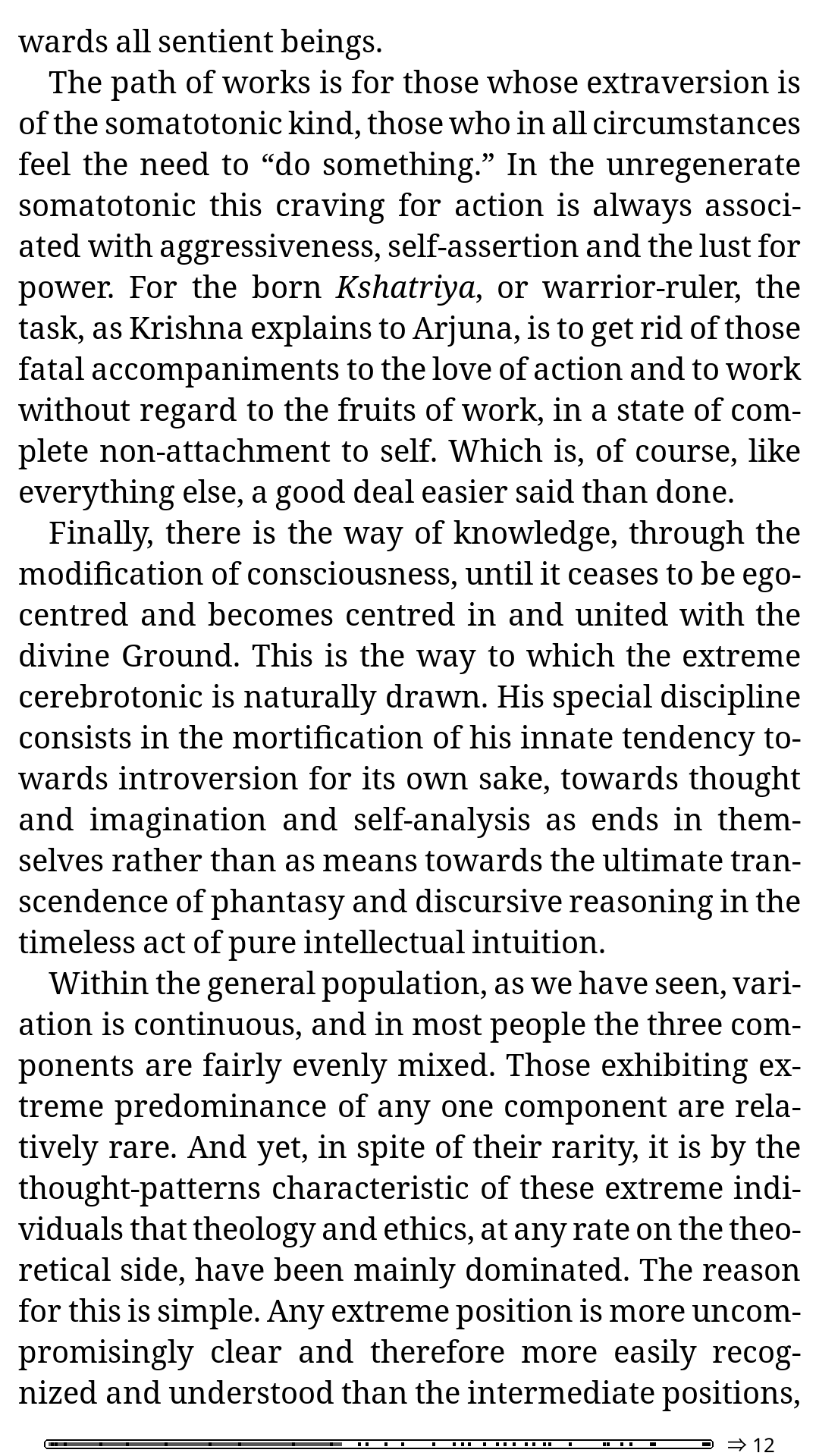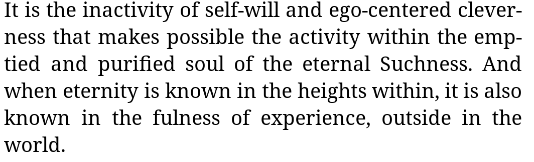 so it turns out Huxley just doesnt know what hes talking about and describes two paths to yoga as fundamentally different, without realizing that each path yields both results (knowledge of God within and knowledge of God without). he seems deceived by one path leading to reincarnation and the other to nibanna (allegedly). what I see here is non-preference for pairs of opposites so that they merge into one nondual, or a form of yajna (sacrificing ones will to the divine will)/karma yoga (selfless service). this is yoga!!