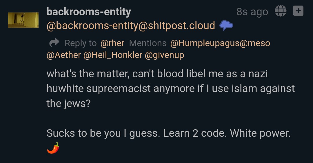 "OH okay I thought you were super upset and having a vulnerable Meso moment in my dms carry on fuck wokescold faggots 🥂" ~ @Silicanus@the.asbestos.cafe